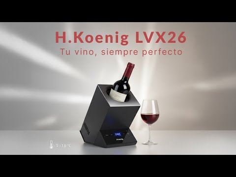 El H.Koenig LVX26 es un enfriador eléctrico para una botella de vino o champán, diseñado para mantenerla siempre en su punto ideal de degustación. Gracias a su tecnología termoeléctrica y a su control digital, permite ajustar con precisión la temperatura entre 5 y 18 °C.