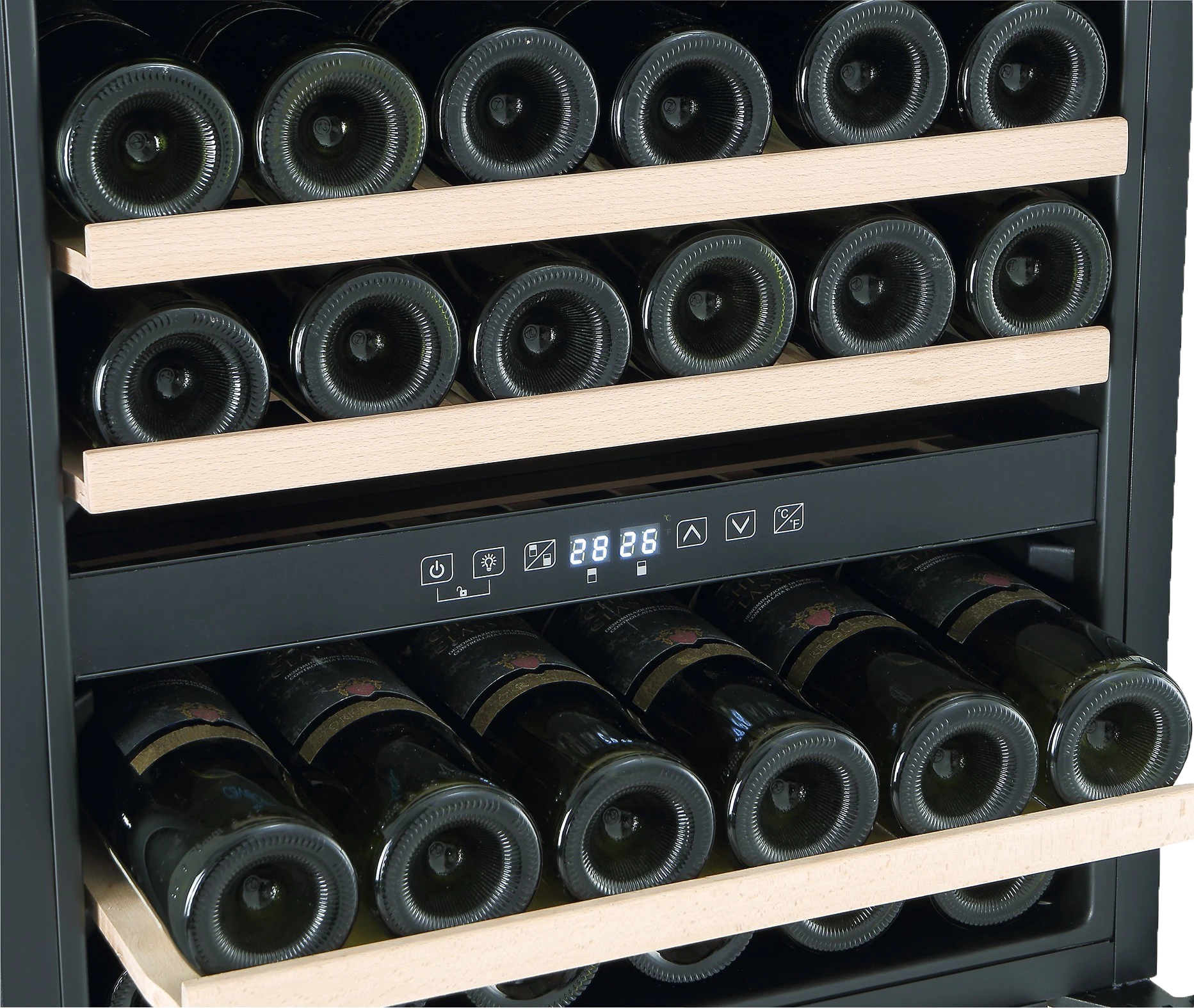 Su diseño elegante en negro, con puerta reversible de doble cristal anti-UV, permite una integración perfecta en cualquier cocina. Equipada con 2 estantes de madera, iluminación LED y display digital, permite un ajuste preciso de la temperatura grado a grado.