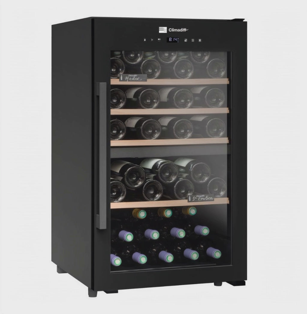 La Climadiff CLD55B1 es una gran solución para la climatización de vinos, integrando dos compartimentos de temperatura controlada, gestión remota a través de la app Vinotag, un sistema de amortiguación de vibraciones y un diseño eco-eficiente que garantiza la preservación de las cualidades de hasta 56 botellas.